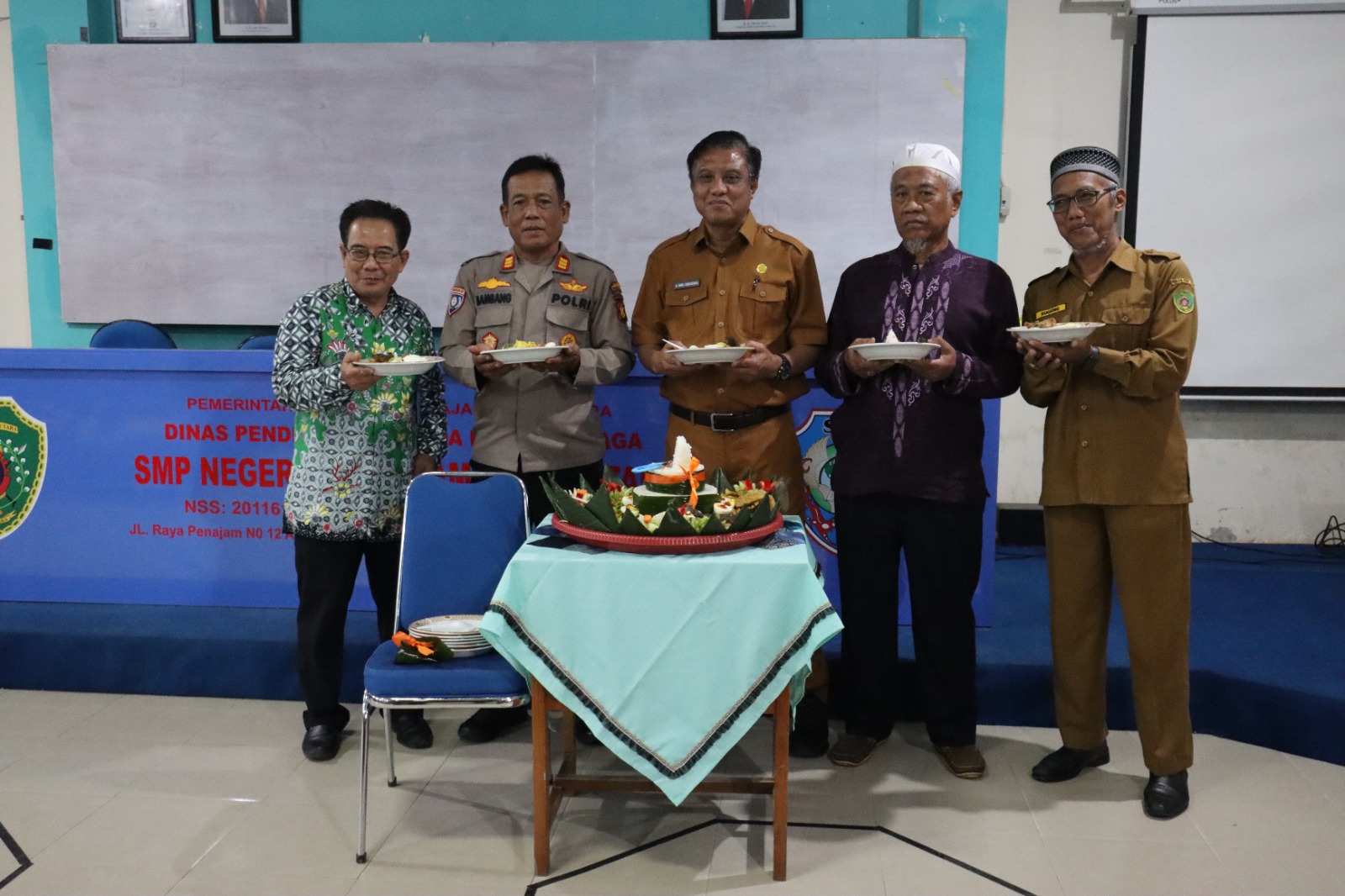Acara yang direncanakan berlangsung di lapangan ini terpaksa dipindahkan ke Aula pertemuan SMP Negeri 1 akibat cuaca yang tidak mendukung. Meskipun demikian, suasana tetap meriah dan penuh semangat dengan kehadiran sejumlah tokoh penting, termasuk Kepala Dinas Perikanan, Kepala Badan Kesbangpol, unsur Forkopimda, tokoh agama, tokoh masyarakat, serta undangan lainnya.