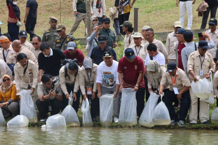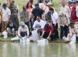 PENAJAM – Bupati Penajam Paser Utara (PPU) Mudyat Noor bersama Kepala Otorita Ibu Kota Nusantara (OIKN) Basuki Hadimuljono melepas secara simbolis 10 ribu bibit ikan papuyu di Embung Muhammad Basuki Hadimuljono (MBH), Kecamatan Sepaku, Minggu (21/9/2025).