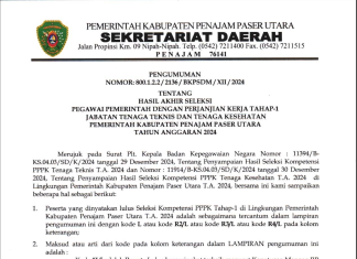 PENGUMUMAN TENTANG HASIL AKHIR SELEKSI PEGAWAI PEMERINTAH DENGAN PERJANJIAN KERJA TAHAP-1 JABATAN TENAGA TEKNIS DAN TENAGA KESEHATAN PEMERINTAH KABUPATEN PENAJAM PASER UTARA TAHUN ANGGARAN 2024