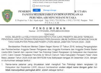 PENGUMUMAN HASIL SELEKSI UJI KELAYAKAN DAN KEPATUTAN (UKK) PESERTA SELEKSI TERBUKA PENGISIAN JABATAN DEWAN PENGAWAS PERUSAHAAN UMUM DAERAH AIR MINUM DANUM TAKA KEBUPATEN PENAJAM PASER UTARA MASA JABATAN TAHUN 2024-2028